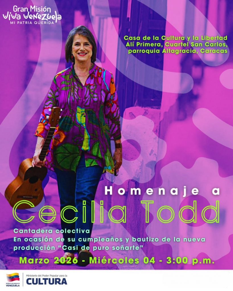 La Gran Misión Viva Venezuela Mi Patria Querida, (GMVV) a través de su vértice de Organización y Participación, realizará un homenaje especial a la destacada cultora Cecilia Todd este miércoles 04 de marzo de 2026. El evento, que iniciará a las 3:00 p. m. en la Casa de la Cultura y la Libertad Alí Primera, ubicada en el Cuartel San Carlos de la parroquia Altagracia, servirá como escenario para celebrar el cumpleaños de la artista y el bautizo de su más reciente producción discográfica titulada “Casi de puro soñarte”
