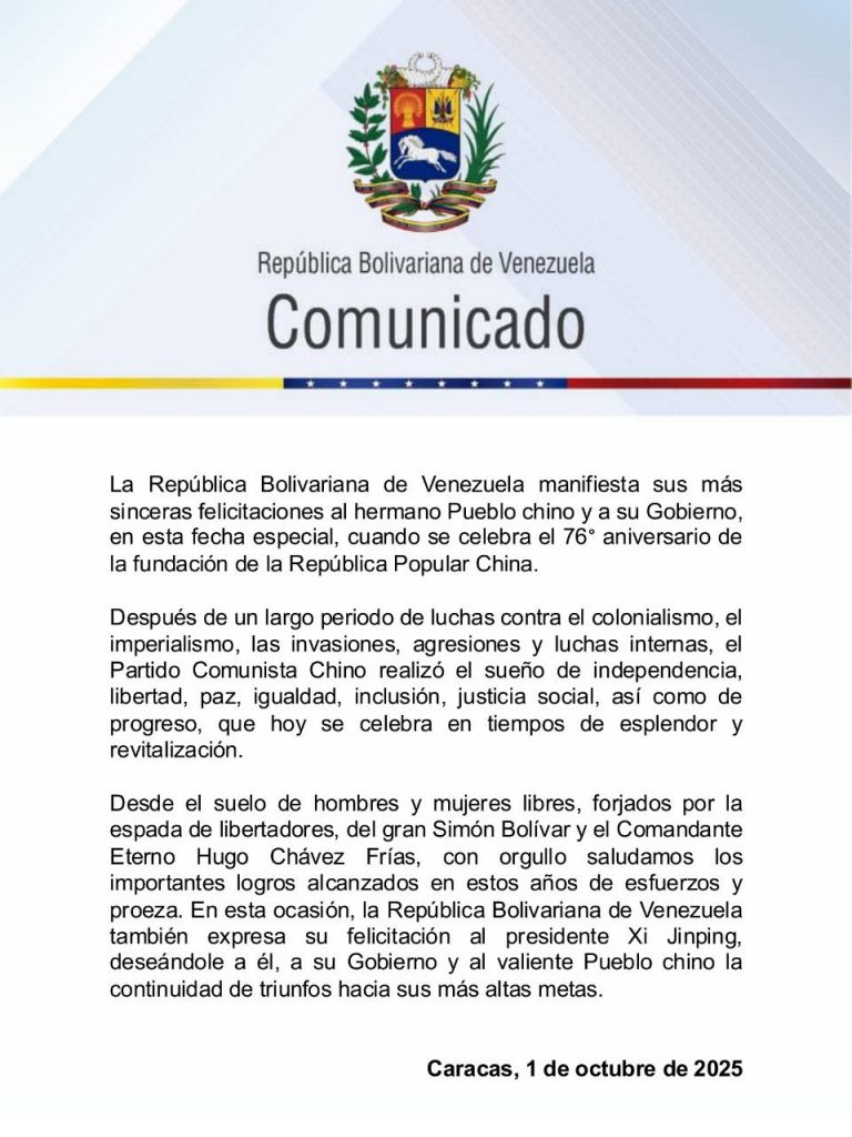 Caracas, 1 de octubre del 2025: A través de un comunicado oficial, la República Bolivariana de Venezuela manifiesta sus más sinceras felicitaciones al hermano Pueblo chino y a su Gobierno, en esta fecha especial, cuando se celebra el 76.° aniversario de la fundación de la República Popular China.