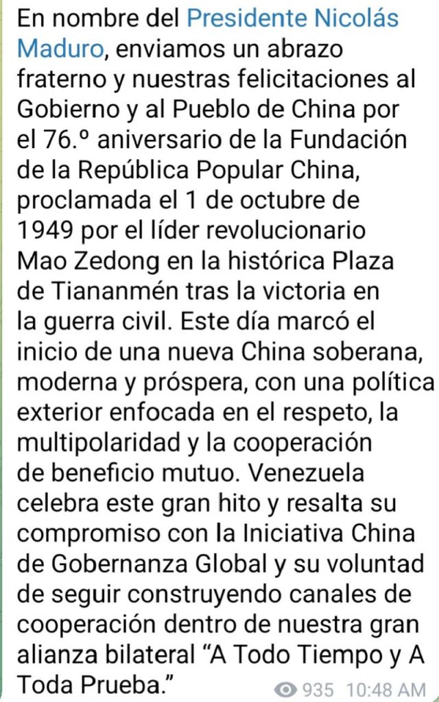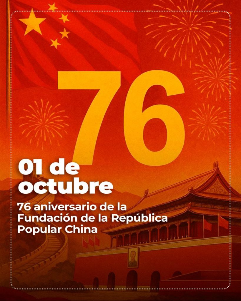 Asimismo, el ministro de Relaciones Exteriores, Yván Gil, compartió una publicación en nombre del presidente de la República de Venezuela, Nicolás Maduro, donde celebra y felicita al Pueblo de China por el 76.º aniversario de la Fundación de la República Popular China, proclamada el 1 de octubre de 1949 por el líder revolucionario Mao Zedong en la histórica Plaza de Tiananmén tras la victoria en la guerra civil.