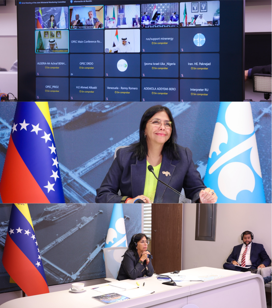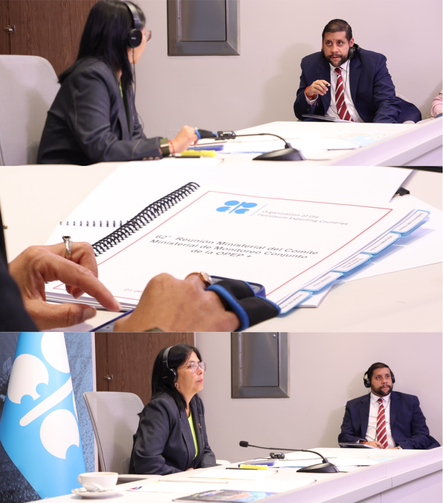 Caracas, 1 de octubre del 2025. – La vicepresidenta Ejecutiva de la República Bolivariana de Venezuela, Delcy Rodríguez, participó este miércoles por videoconferencia en la sexagésima segunda (62a) Reunión del Comité Ministerial de Monitoreo Conjunto (JMMC) de la Organización de Países Exportadores de Petróleo (OPEP) y (OPEP+), encuentro centrado en el análisis de las dinámicas y acciones recientes en el mercado petrolero global.