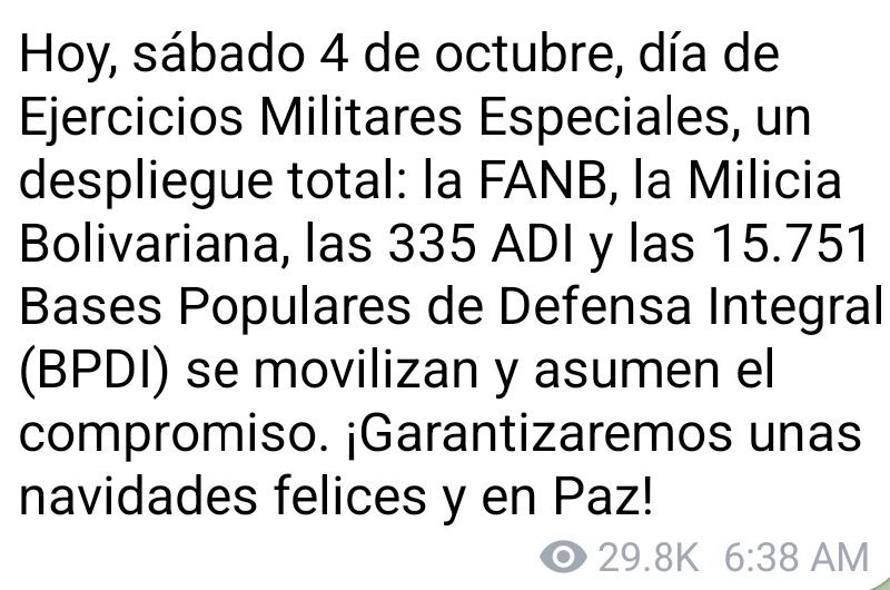 Caracas, 4 de octubre del 2025: El presidente de la República Bolivariana de Venezuela, Nicolás Maduro, señaló por medio de un trabajo audiovisual difundido en su canal de Telegram que el despliegue incluye la Fuerza Armada Nacional Bolivariana (FANB) y la Milicia Nacional Bolivariana, 335 zonas de Defensa Integral (ADI) y 15 mil 751 Bases Populares de Defensa Integral (BPDI), las cuales se movilizan y asumen el compromiso para asegurar la paz a lo largo del país.
