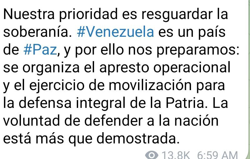 «Nuestra prioridad es resguardar la soberanía. Venezuela es un país de paz, y por ello nos preparamos: se organiza el apresto operacional y el ejercicio de movilización para la defensa integral de la patria. La voluntad de defender a la nación está más que demostrada».