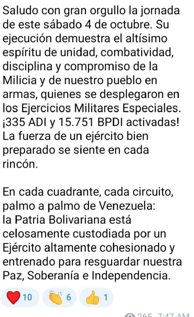 En su mensaje, el mandatario resaltó la preparación estratégica mediante el «apresto operacional y la movilización para la defensa integral de la Patria», subrayando la “voluntad inquebrantable” de la Fuerza Armada y el pueblo para proteger la nación. Con orgullo, saludó la participación de la Milicia Bolivariana y el pueblo en armas, quienes demostraron “unidad, combatividad, disciplina y compromiso” durante los ejercicios.