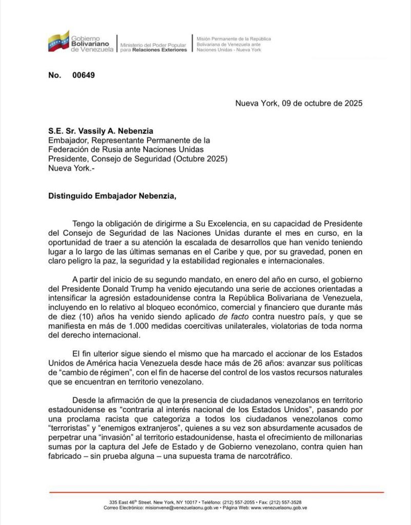 Caracas, 9 de octubre del 2025. —El Gobierno Bolivariano de Venezuela ha solicitado formalmente una reunión de urgencia del Consejo de Seguridad de las Naciones Unidas, ante la grave escalada de agresiones y despliegue militar sin precedentes de los Estados Unidos en el Caribe.