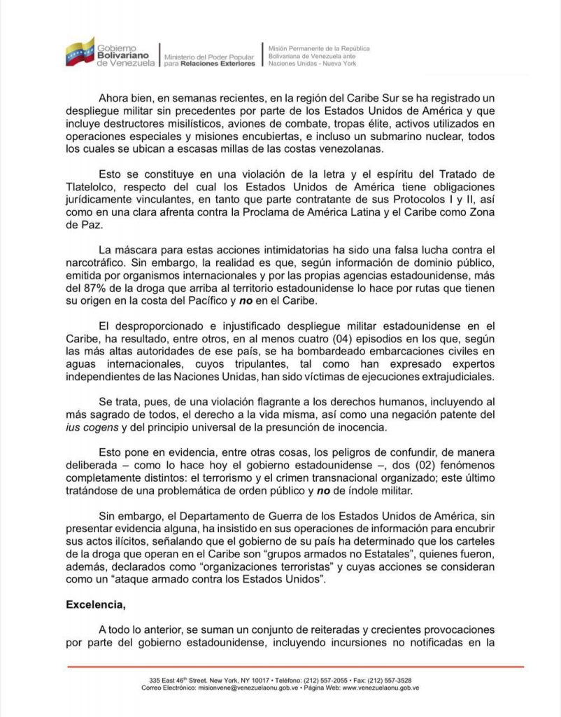 La solicitud, dirigida al embajador Vassily A. Nebenzia, presidente del Consejo de Seguridad, advierte que las acciones de EE. UU. en las últimas semanas, que incluyen destructores misilísticos, aviones de combate, tropas élite y un submarino nuclear cerca de las costas venezolanas, ponen en claro peligro la Zona de Paz en América Latina y el Caribe.