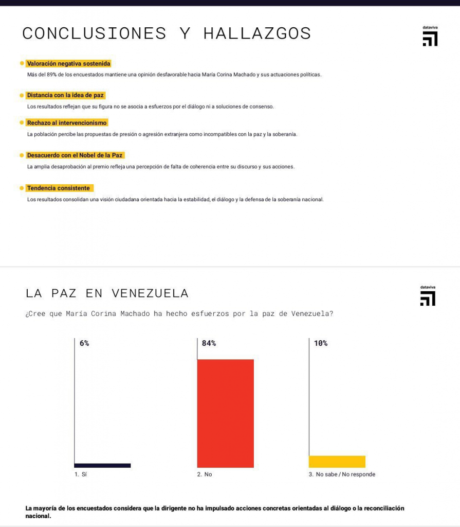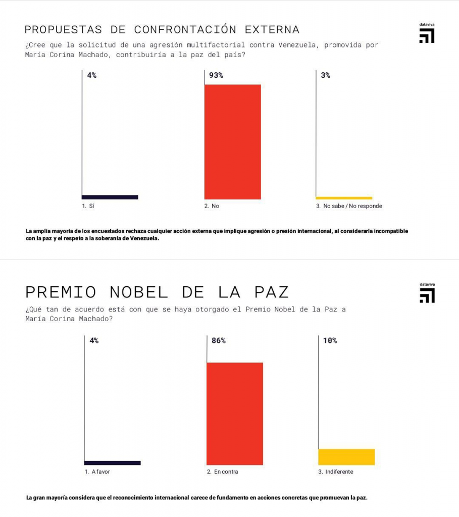 En consecuencia, la encuesta también exploró la opinión pública respecto a la propuesta de otorgarle el Premio Nobel de la Paz a María Corina Machado. Un categórico 86% de los consultados manifestaron estar en total desacuerdo con dicho reconocimiento, frente a un cuatro por ciento que se mostró a favor. Los resultados de DataViva reflejan una tendencia consistente de la población venezolana, orientada hacia la estabilidad, la defensa de la soberanía nacional y el rechazo a figuras que promuevan la confrontación y la injerencia extranjera.