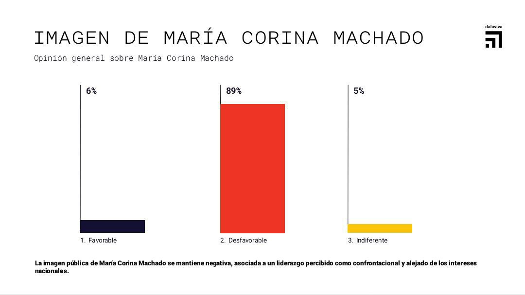 La encuesta de DataViva evidenció que la inmensa mayoría de venezolanos asocia el liderazgo de Machado a un papel percibido como confrontacional y, sobre todo, alejado de los intereses nacionales de paz y estabilidad