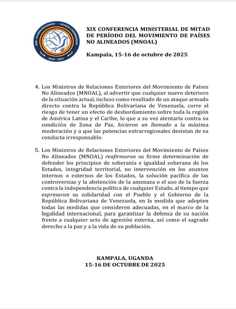 Caracas, 15 de octubre del 2025. –Los Ministros de Relaciones Exteriores del Movimiento de Países No Alineados (MNOAL) se reunieron en la XIX Conferencia Ministerial, celebrada en Kampala, República de Uganda, donde expresaron su profunda preocupación por los desarrollos en curso en la región del Caribe.