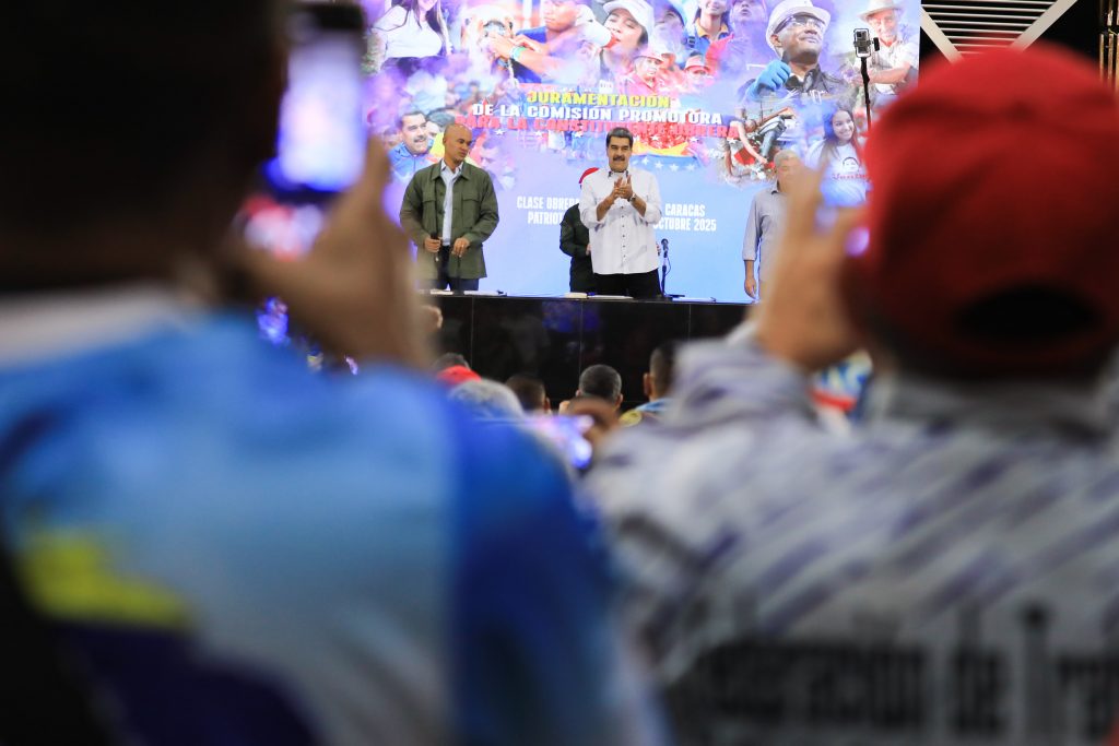 Caracas, 23 de octubre del 2025: El presidente de la República Bolivariana de Venezuela, Nicolás Maduro Moros, llegó este jueves a la Sala Plenaria Darío Vivas, ubicada en el complejo Parque Central en Caracas, para encabezar el acto de juramentación de la Comisión Promotora que dará vida a la Constituyente Obrera.