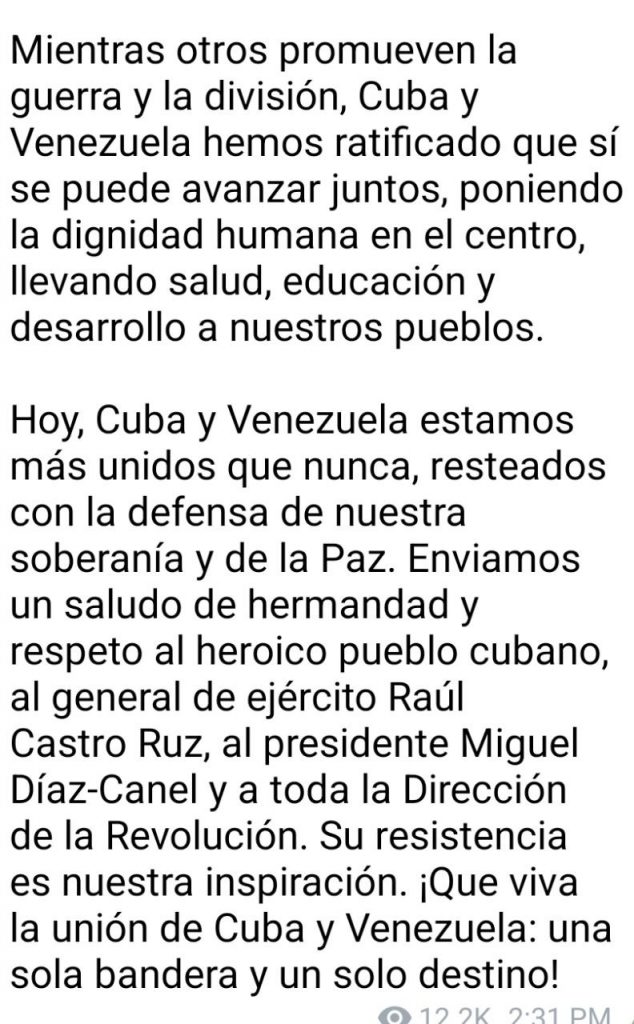 Finalmente, el primer mandatario saludó al Pueblo y Gobierno de Cuba. «Enviamos un saludo de hermandad y respeto al heroico pueblo cubano, al general de ejército Raúl Castro Ruz, al presidente Miguel Díaz-Canel y a toda la Dirección de la Revolución. Su resistencia es nuestra inspiración«. ¡Que viva la unión de Cuba y Venezuela: una sola bandera y un solo destino!