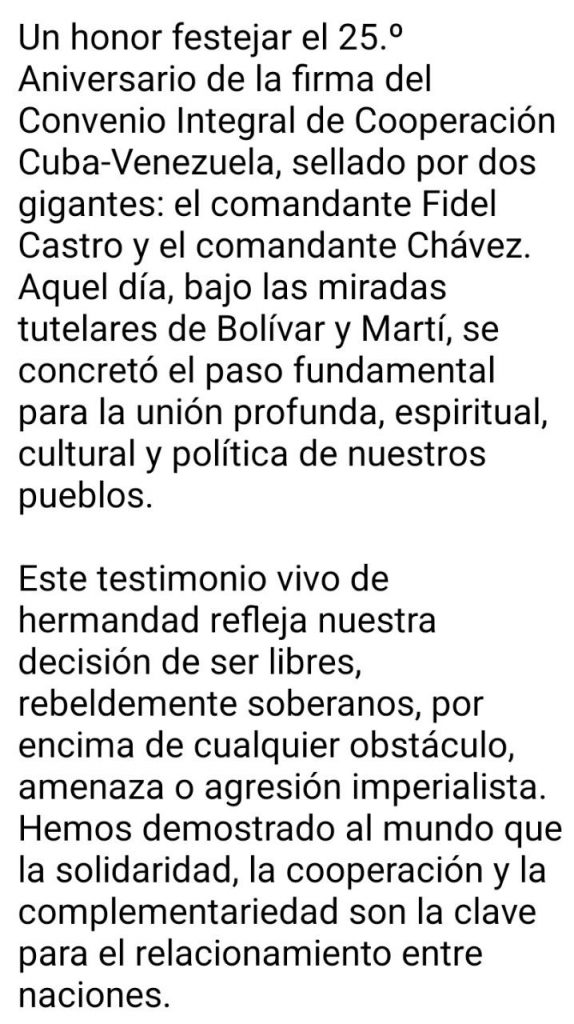 En el trabajo audiovisual expresó: «Un honor festejar el 25.º Aniversario de la firma del Convenio Integral de Cooperación Cuba-Venezuela, sellado por dos gigantes: el comandante Fidel Castro y el comandante Chávez. Aquel día, bajo las miradas tutelares de Bolívar y Martí, se concretó el paso fundamental para la unión profunda, espiritual, cultural y política de nuestros pueblos».
