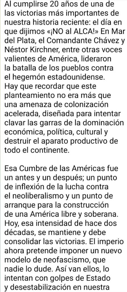 En su publicación, el jefe de Estado destacó que aquel «¡NO al ALCA!» constituye» una de las victorias más importantes de nuestra historia reciente». Enfatizó el liderazgo del Comandante Hugo Chávez y del entonces presidente argentino, Néstor Kirchner, a quienes calificó, junto a otros mandatarios, como «voces valientes de América» que «lideraron la batalla de los pueblos contra el hegemón estadounidense».