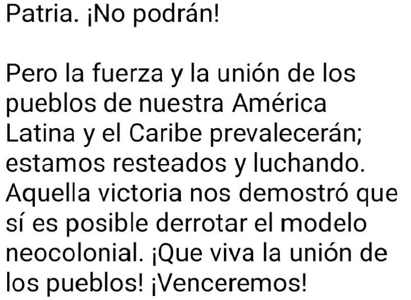 Finalizó su mensaje con un llamado a la unidad y un espíritu de combate, asegurando que «la fuerza y la unión de los pueblos de nuestra América Latina y el Caribe prevalecerán». Concluyó con las consignas: «¡Que viva la unión de los pueblos! ¡Venceremos!».