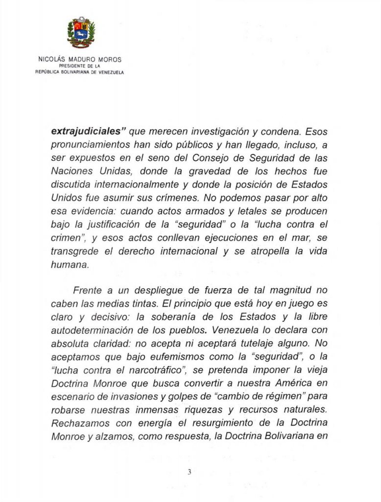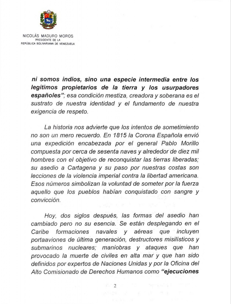 Asimismo, Maduro enfatizó que el despliegue de buques de guerra, un submarino y aviones de combate frente a las costas venezolanas constituye una «amenaza directa» a la estabilidad regional. «Frente a un despliegue de fuerza de tal magnitud no caben medias tintas».
