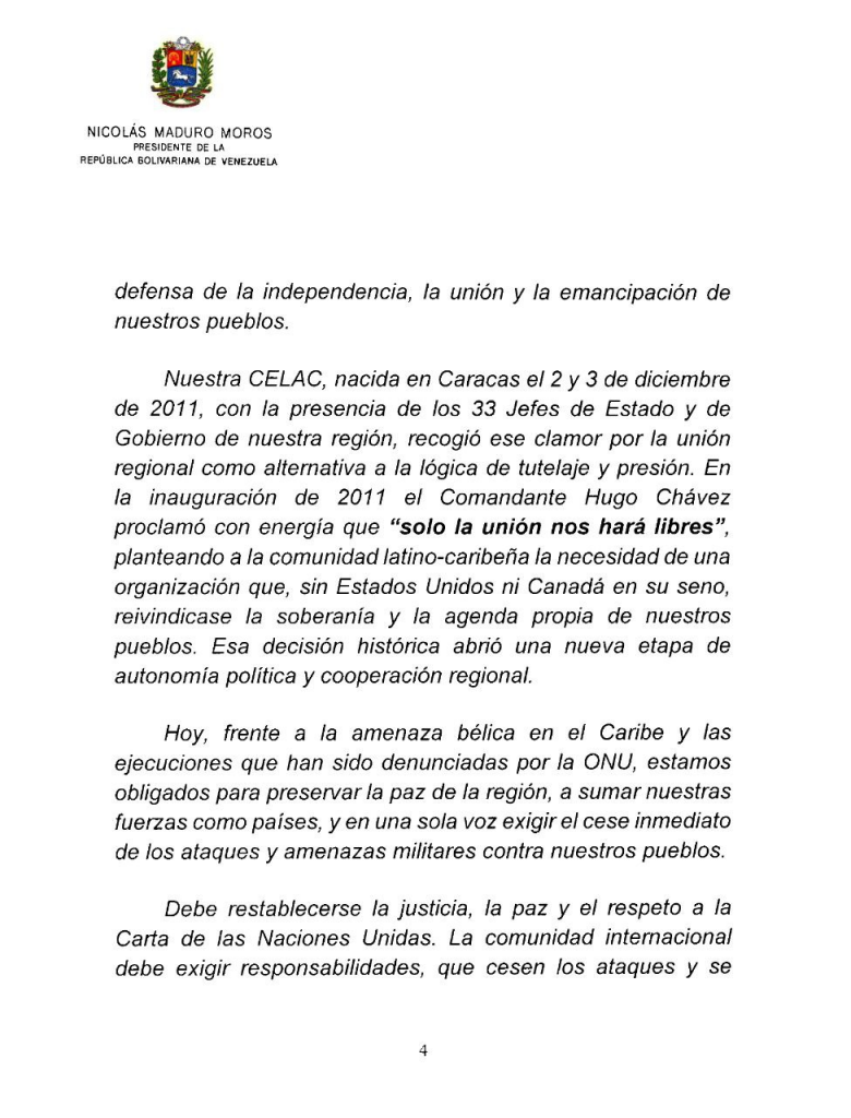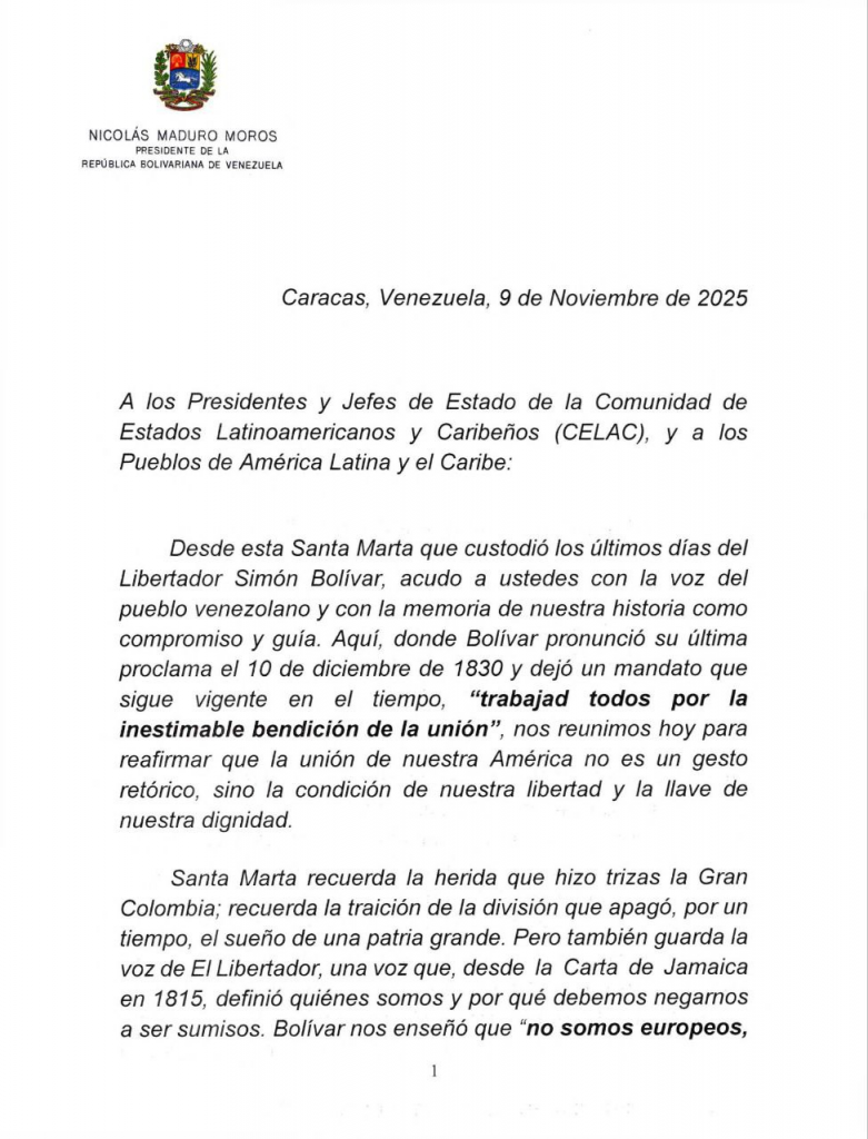 Caracas, 9 de noviembre del 20215. – El presidente de la República Bolivariana de Venezuela, Nicolás Maduro, alertó este domingo a los líderes de América Latina, el Caribe y Europa reunidos en la IV Cumbre Celac–UE, denunciando el creciente e inaceptable despliegue militar de Estados Unidos en el mar Caribe y sus graves implicaciones para la paz y la soberanía de la región.