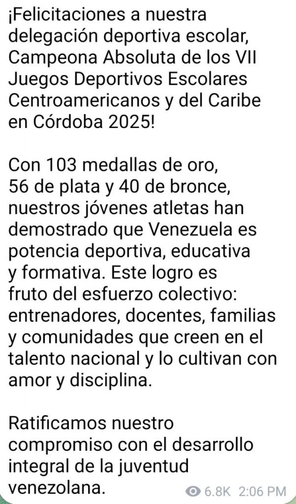 El jefe de Estado, a través de su cuenta oficial en Telegram, compartió que «la brillante participación del conjunto criollo logró obtener un total de 103 medallas de oro, 56 de plata y 40 de bronce; nuestros jóvenes atletas han demostrado el talento y la dedicación que posicionan a Venezuela como una potencia deportiva, educativa y formativa en la región».
