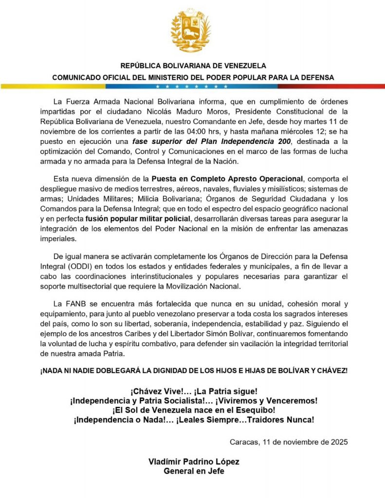Caracas, 11 de noviembre de 2025. – La Fuerza Armada Nacional Bolivariana (FANB) informó que, bajo las órdenes del ciudadano presidente constitucional de la República Bolivariana de Venezuela, Nicolás Maduro Moros, y en cumplimiento de su rol como comandante en jefe, se ha puesto en marcha a partir de las 04:00 horas de este martes 11 de noviembre una fase superior del Plan Independencia 200, diseñada para optimizar el comando, control y comunicaciones en el marco de la defensa integral de la nación.