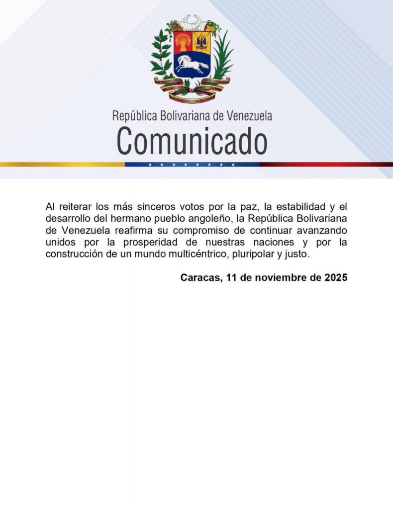 Caracas, 11 de noviembre de 2025: Este martes, en un comunicado oficial, la República Bolivariana de Venezuela expresó que en esta fecha de profunda significación histórica, rendimos homenaje a los hombres y mujeres angoleños que, con indeclinable valor, lucharon por su emancipación frente al colonialismo portugués, desde el heroico 4 de febrero de 1961 hasta la victoria definitiva del 11 de noviembre de 1975.