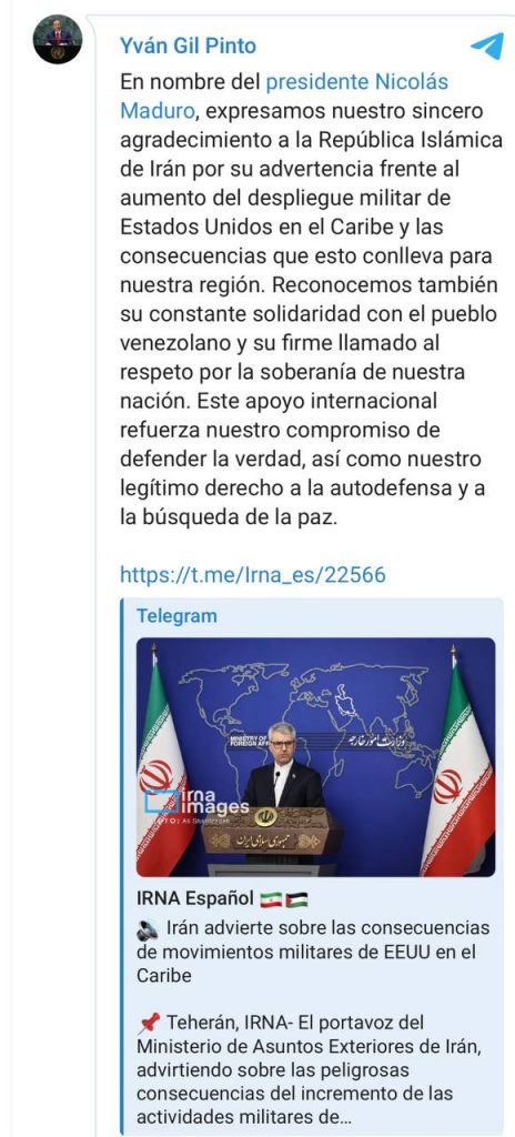 La República de Venezuela agradece a Irán su respaldo frente al aumento del despliegue militar de Estados Unidos en el Caribe y las consecuencias que esto conlleva para la nación bolivariana