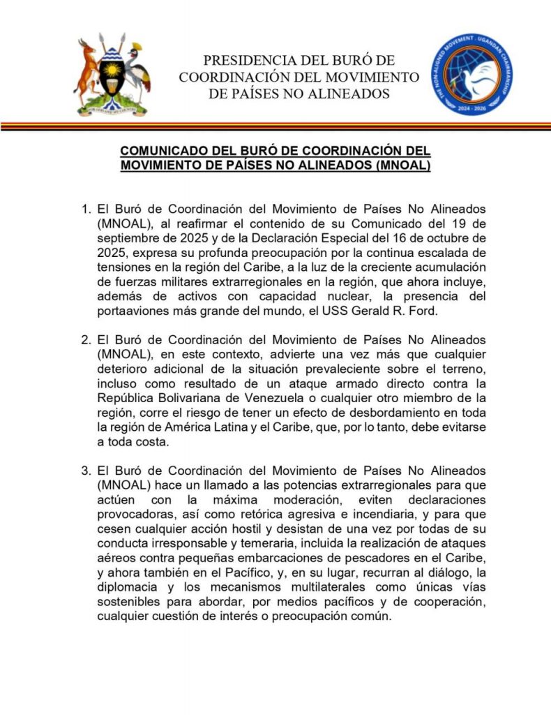 El Buró de Coordinación del Movimiento de Países No Alineados (MNOAL) expresa su profunda preocupación por la continua escalada de tensiones en la región del Caribe, a la luz de la creciente acumulación de fuerzas militares extrarregionales en la región, que ahora incluye, además de activos con capacidad nuclear, la presencia del portaaviones más grande del mundo, el USS Gerald R. Ford
