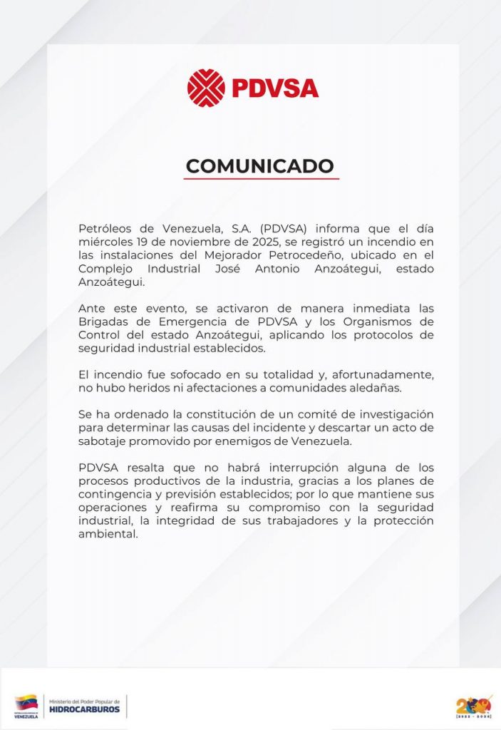 Caracas, 20 de noviembre del 2025: Este jueves, mediante un comunicado oficial, Petróleos de Venezuela, S.A. (PDVSA) informa que el día miércoles 19 de noviembre de 2025, se registró un incendio en las instalaciones del Mejorador Petrocedeño, ubicado en el Complejo Industrial José Antonio Anzoátegui, estado Anzoátegui.