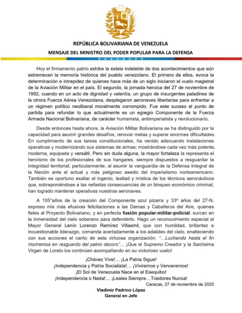 Caracas, 27 de noviembre de 2025: A través de un comunicado oficial, el vicepresidente sectorial de Defensa y Soberanía, G/J Vladimir Padrino López, expresó: Hoy el firmamento patrio exhibe la estela indeleble de dos acontecimientos que aún estremecen la memoria histórica del pueblo venezolano. El primero de ellos evoca la determinación e intrepidez de quienes hace más de un siglo iniciaron el vuelo magistral de la Aviación Militar en el país.