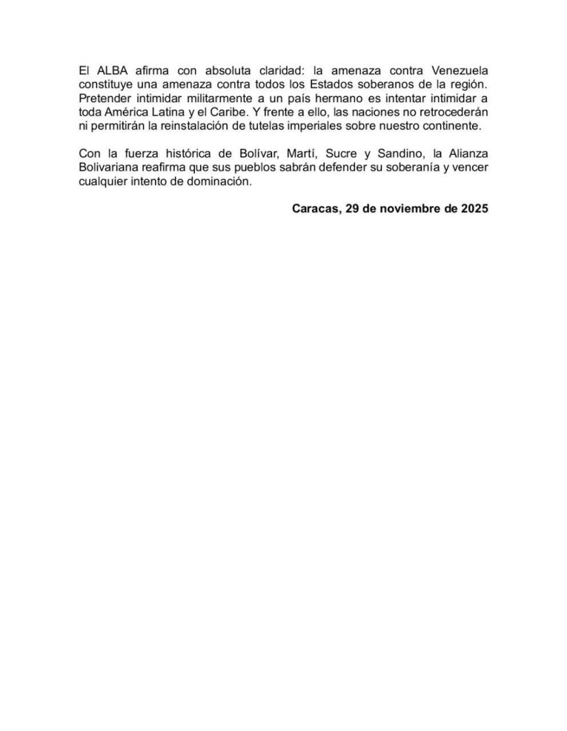 Caracas, 29 de noviembre de 2025: En un comunicado oficial, la Alianza Bolivariana para los Pueblos de Nuestra América (ALBA) expresa su más enérgica, categórica y frontal condena ante la nueva amenaza colonialista emitida por el presidente de los Estados Unidos contra la soberanía del espacio aéreo de la República Bolivariana de Venezuela.