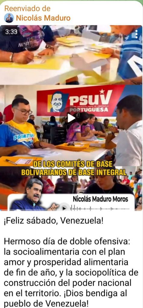 A través de su red social Telegram, el jefe de Estado compartió: «¡Feliz sábado, Venezuela! Hermoso día de doble ofensiva: la socioalimentaria con el Plan Amor y Prosperidad Alimentaria de fin de año, y la sociopolítica de construcción del poder nacional en el territorio. ¡Dios bendiga al pueblo de Venezuela!».