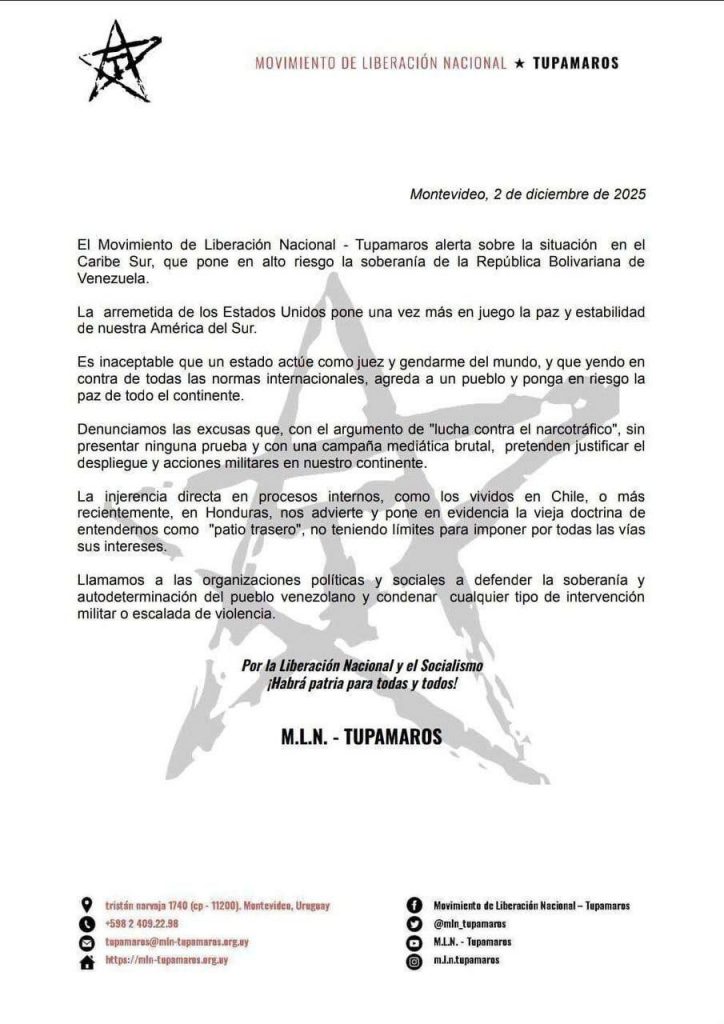 Caracas, 2 de diciembre de 2025: El Movimiento de Liberación Nacional Tupamaros emitió un comunicado donde alerta sobre la situación en el Caribe Sur, que pone en alto riesgo la soberanía de la República Bolivariana de Venezuela. La arremetida de los Estados Unidos pone una vez más en juego la paz y estabilidad de nuestra América del Sur.