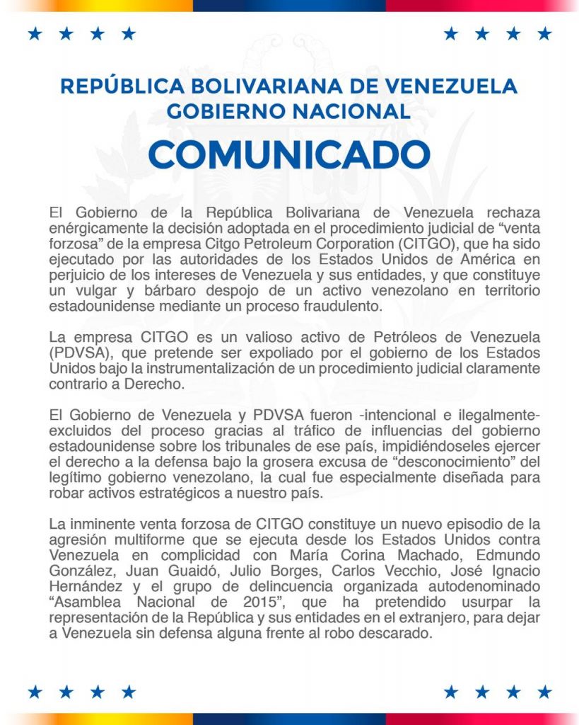 El Gobierno de la República Bolivariana de Venezuela, en defensa de los intereses del pueblo venezolano, rechaza categóricamente la decisión ilegal y fraudulenta de la venta forzosa de CITGO Petroleum Corporation, ejecutada por sectores extremistas venezolanos al servicio de los intereses geopolíticos de Estados Unidos.