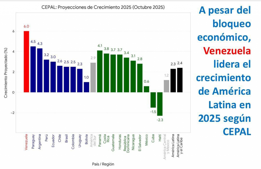 Rodríguez destacó el desempeño económico actual del país, señalando que, a pesar de las medidas coercitivas unilaterales (bloqueo), Venezuela se proyecta como líder en crecimiento económico de América Latina. La funcionaria informó que, si bien la CEPAL estimó un crecimiento del 6% para 2025, el país ha superado esa cifra, registrando un crecimiento consolidado del Producto Interno Bruto (PIB) del 8.5%.