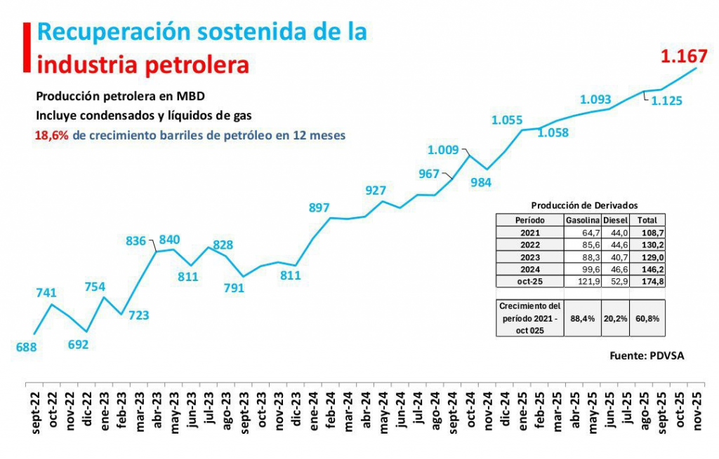 Además, Rodríguez reafirmó el compromiso del Gobierno de continuar la recuperación productiva, con la meta de alcanzar 1.200.000 barriles diarios de producción petrolera.