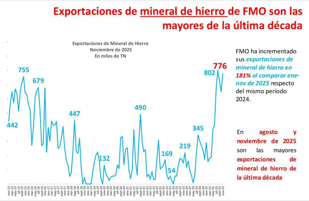 • La exportación de mineral de hierro creció un 181% en comparación con 2024, siendo el mayor registro de la última década.