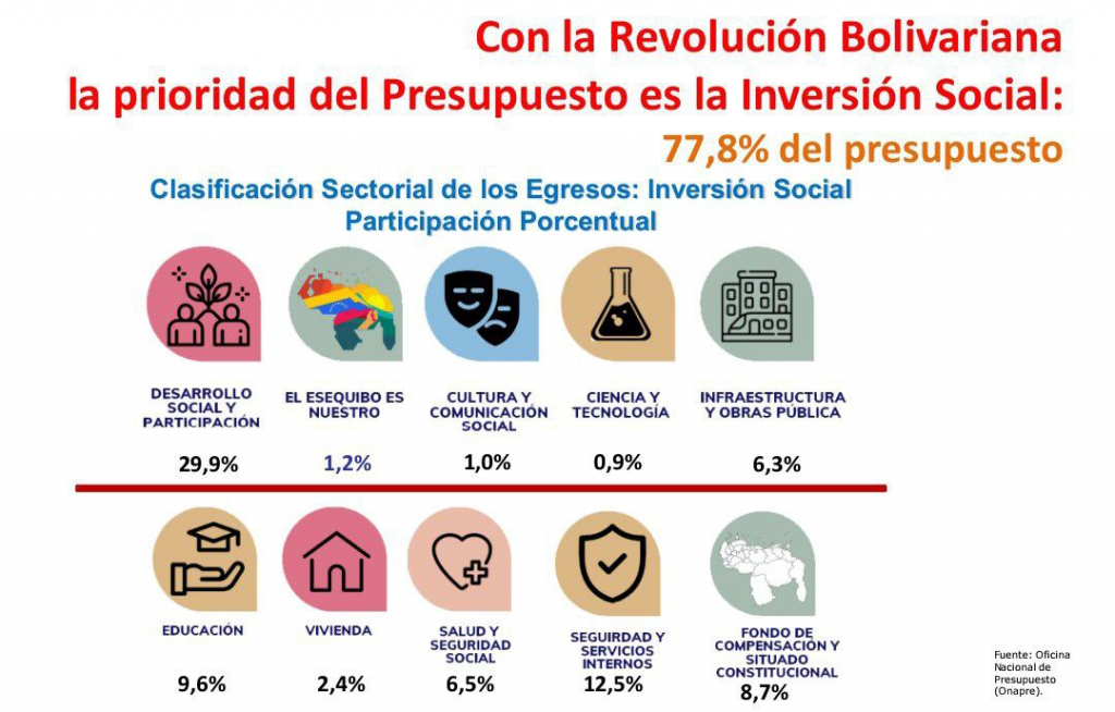 Vielma Mora sostiene que este presupuesto robustecerá el desarrollo social de la nación; como señaló Rodríguez, la vicepresidenta, «el 77,8 % se utilizará para fortalecer la inversión social».
