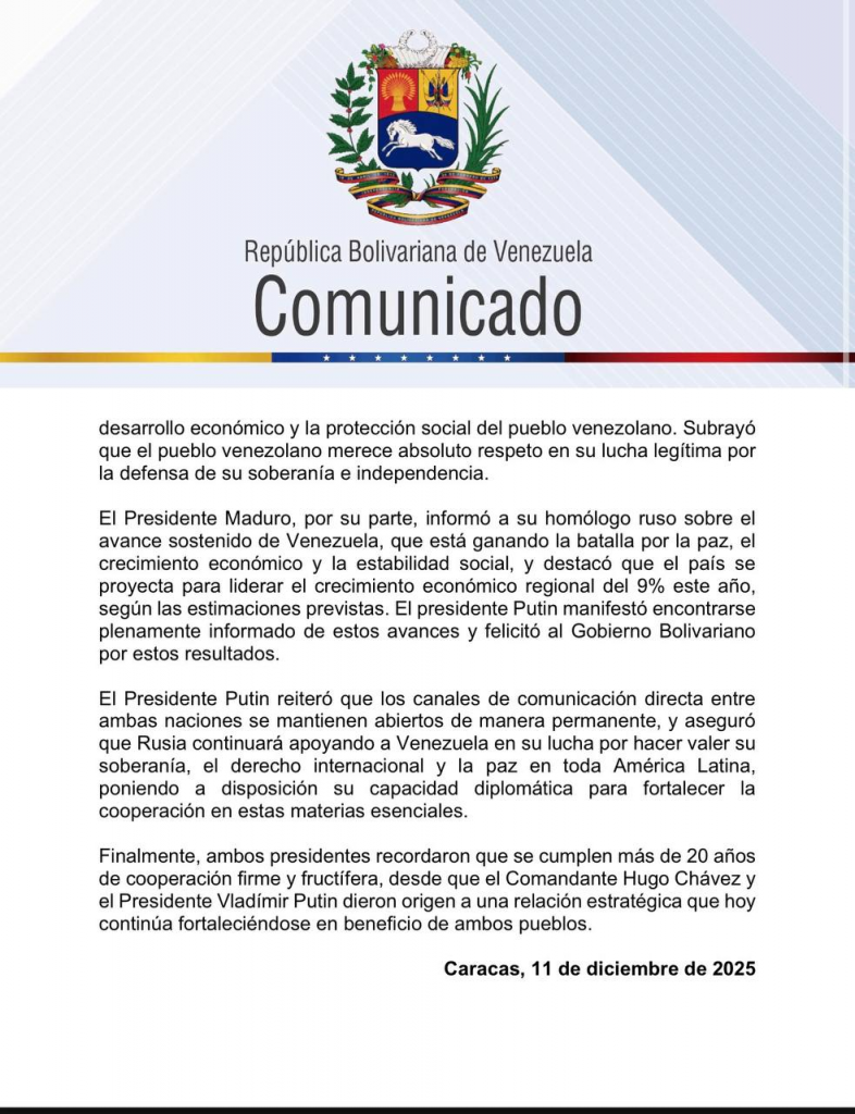 Caracas, 11 de diciembre del 2025. – El ministro para Relaciones Exteriores, Yván Gil, informó que la República Bolivariana de Venezuela ha emitido un comunicado oficial donde expresa que el presidente de la Federación de Rusia, Vladímir Putin, ratificó su firme apoyo y respaldo al presidente de la República, Nicolás Maduro, así como a su gobierno y al pueblo venezolano, en la defensa de la paz y la soberanía de la nación.