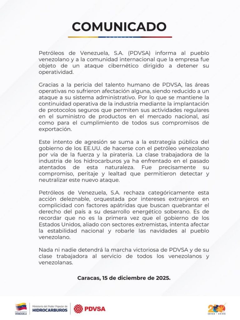 Caracas, 15 de diciembre de 2025. – Petróleos de Venezuela, S.A. (PDVSA) informa al pueblo venezolano y a la comunidad internacional que la empresa fue víctima de un ciberataque dirigido a interrumpir sus operaciones. Sin embargo, gracias a la capacidad del talento humano de PDVSA, las áreas productivas no registraron afectaciones, limitándose el incidente a sistemas administrativos.