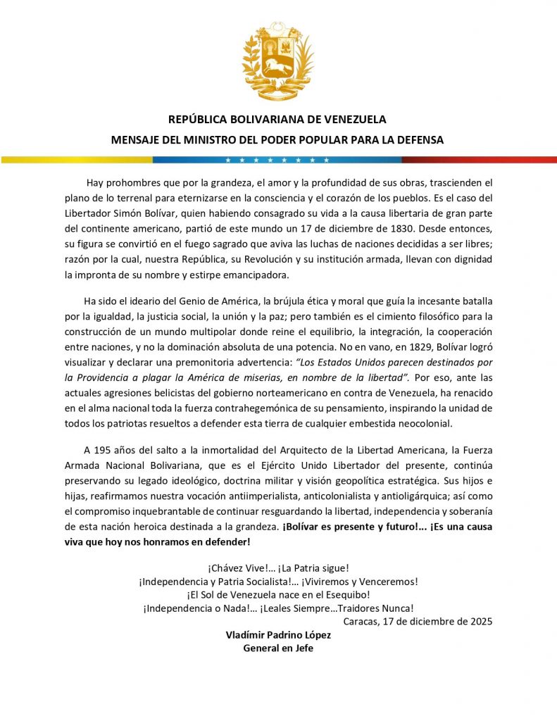 Caracas, 17 de diciembre de 2025. – En un emotivo comunicado, el ministro de Defensa de Venezuela, Vladimir Padrino López, rindió homenaje a la figura del Libertador Simón Bolívar, a 195 años de su paso a la inmortalidad. Padrino López destacó que Bolívar, por la grandeza y profundidad de sus obras, ha trascendido el tiempo y se ha convertido en un símbolo eterno en la consciencia y el corazón de los pueblos latinoamericanos.