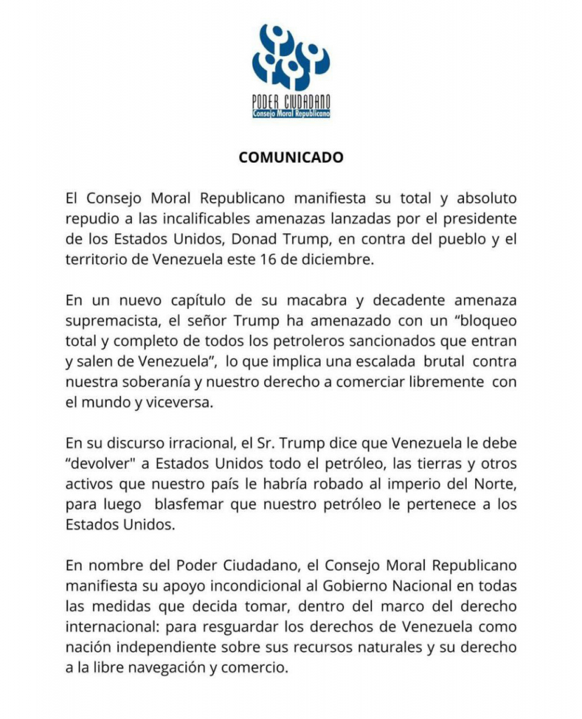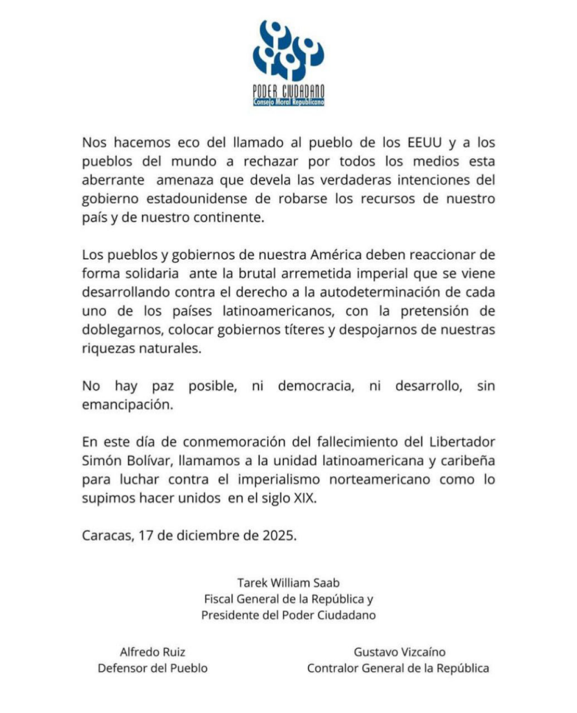 Caracas, 17 de diciembre del 2025. – El Fiscal General de la República, Tarek William Saab, en representación del Poder Ciudadano, a través del Consejo Moral Republicano, emitió este miércoles un pronunciamiento oficial enérgico frente a las recientes amenazas del Gobierno de los Estados Unidos.