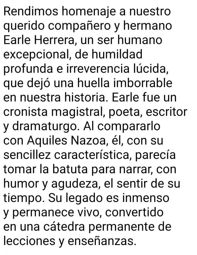 El presidente de la República Bolivariana de Venezuela, Nicolás Maduro, en un mensaje conmemorativo en honor a Earle Herrera, destacó sus cualidades como cronista, poeta, escritor y dramaturgo. Además, elogió su “profunda humildad”, su firme compromiso revolucionario y su apoyo al proyecto bolivariano desde la primera línea