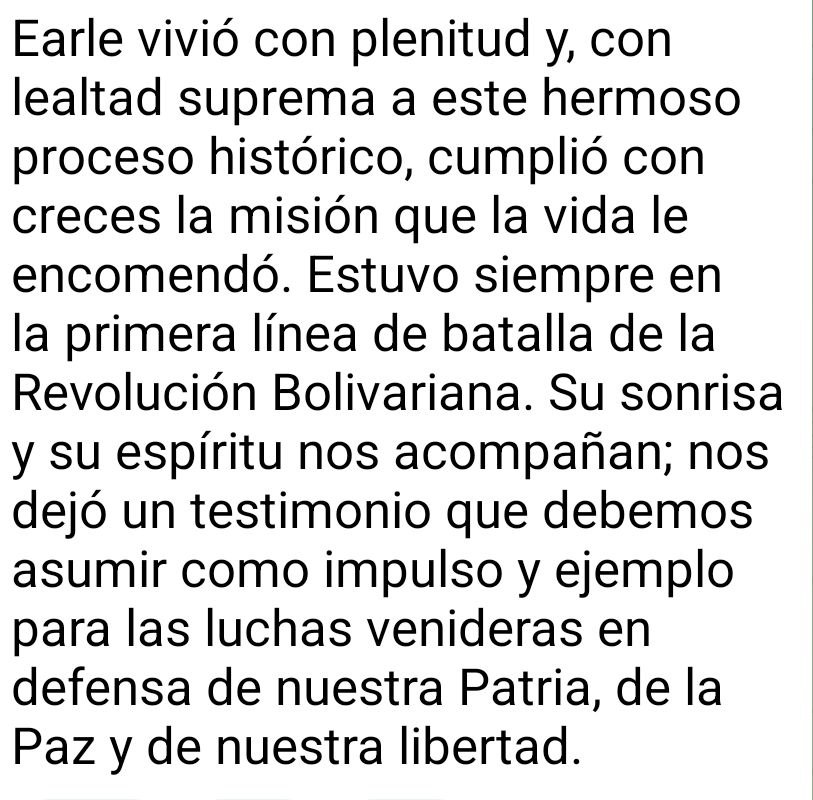 «Earle vivió con plenitud y, con lealtad suprema a este hermoso proceso histórico, cumplió con creces la misión que la vida le encomendó», expresó el mandatario nacional, enfatizando que su sonrisa y espíritu persisten como guía moral para el pueblo.