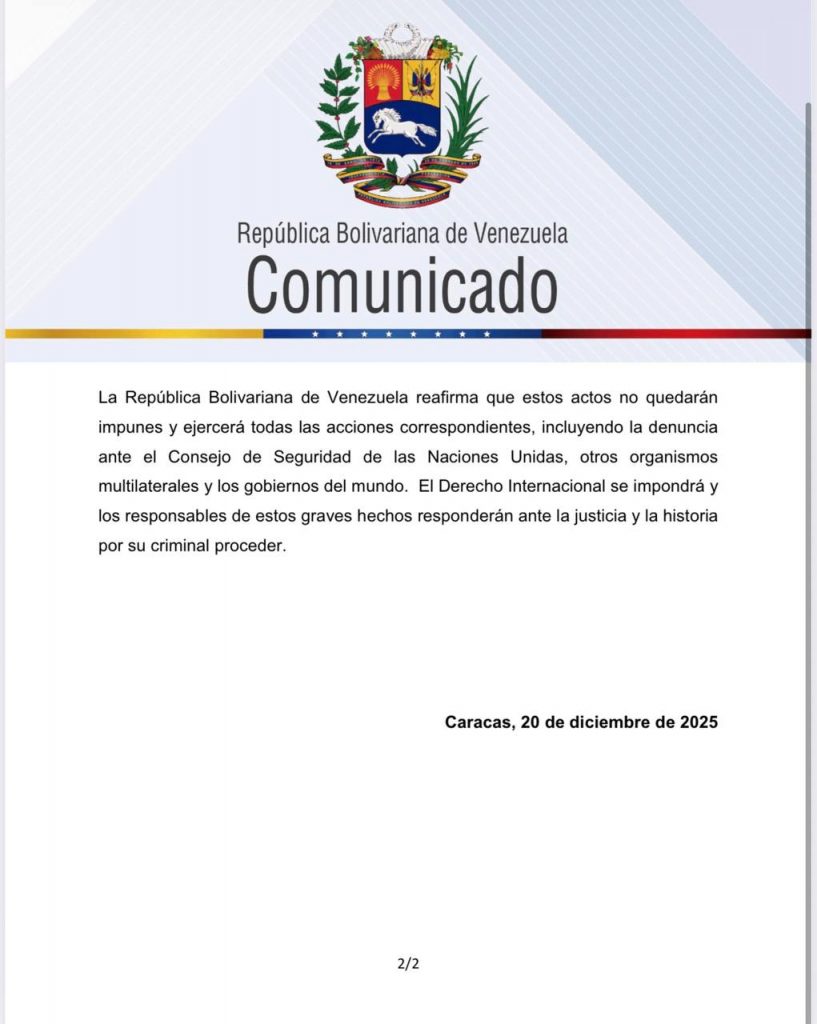 Caracas, 20 de diciembre de 2025. – La vicepresidenta ejecutiva, Delcy Rodríguez, anunció este sábado que la República Bolivariana de Venezuela, mediante un comunicado oficial, repudia de manera categórica el robo de un nuevo buque privado que transportaba petróleo venezolano y la desaparición de su tripulación, por parte del Gobierno de los Estados Unidos.