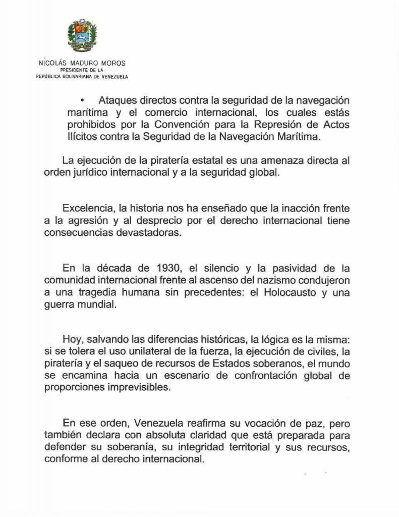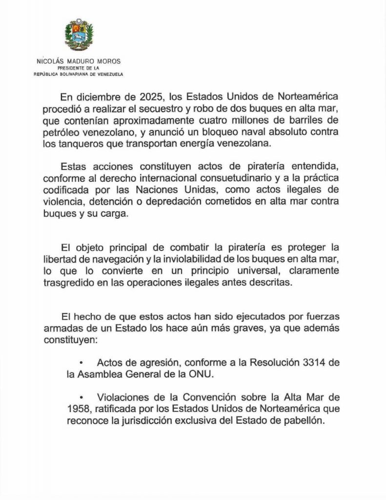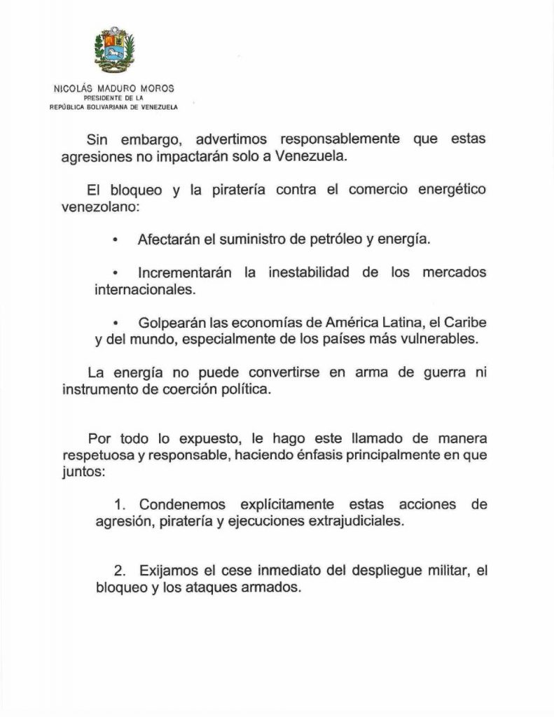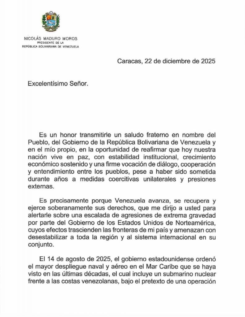 Caracas, 22 de diciembre del 2025. —El presidente Nicolás Maduro ha dirigido una carta a los jefes de Estado de la región latinoamericana y caribeña, instando a una acción conjunta ante las agresiones, actos de piratería y ejecuciones extrajudiciales perpetradas por Estados Unidos en el mar Caribe, reafirmando así al vocación de paz del pueblo venezolano ante el mundo.