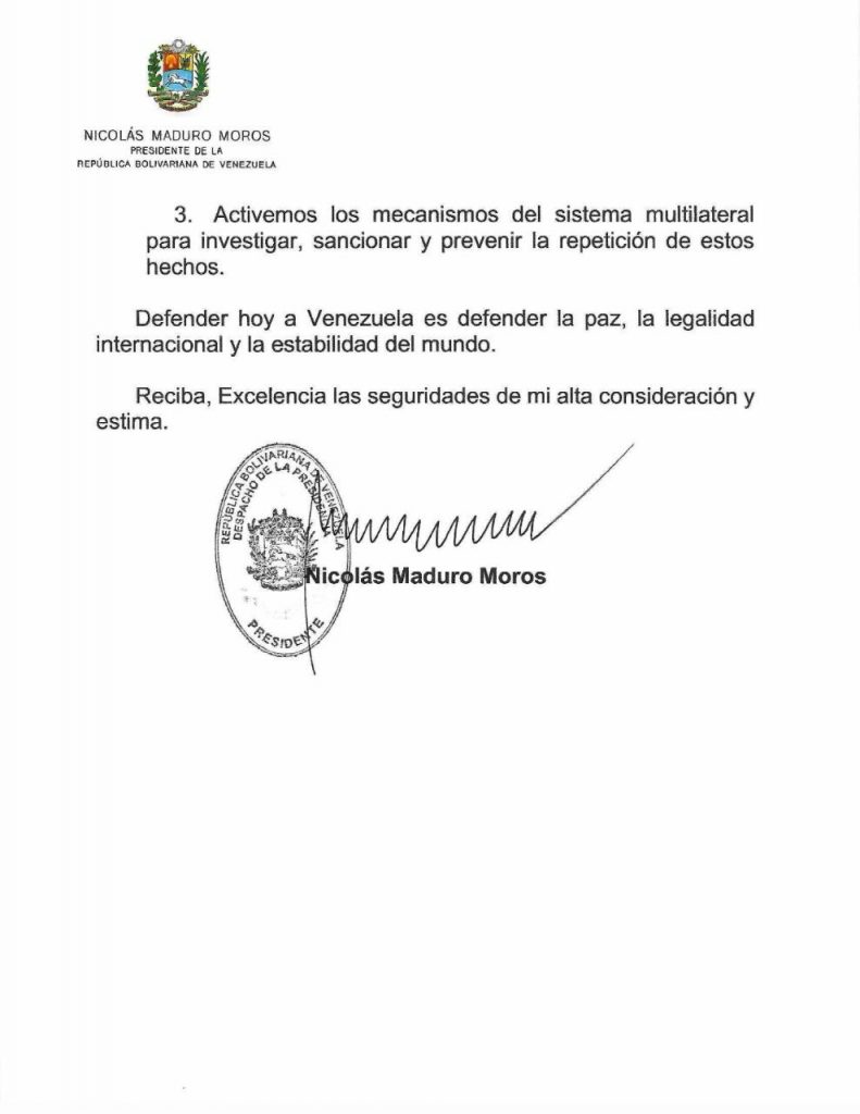 En su misiva, el jefe de Estado venezolano hace un llamado urgente para exigir el cese inmediato del despliegue militar, los bloqueos y los ataques armados.