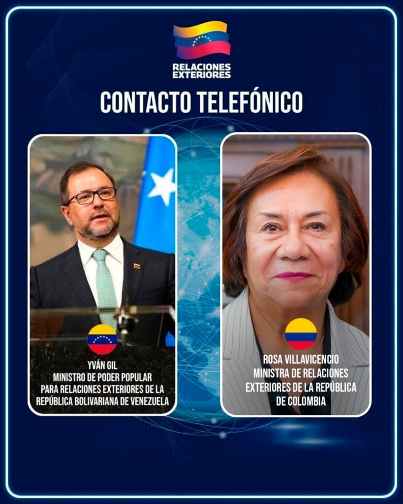 El canciller de la República Bolivariana de Venezuela, Yván Gil, informó este [día] que mantuvo una conversación telefónica con su homóloga de Colombia, Rosa Villavicencio, quien transmitió el apoyo del gobierno y el pueblo colombiano ante lo que calificó como un “ataque criminal e ilegal” por parte de Estados Unidos contra Venezuela.