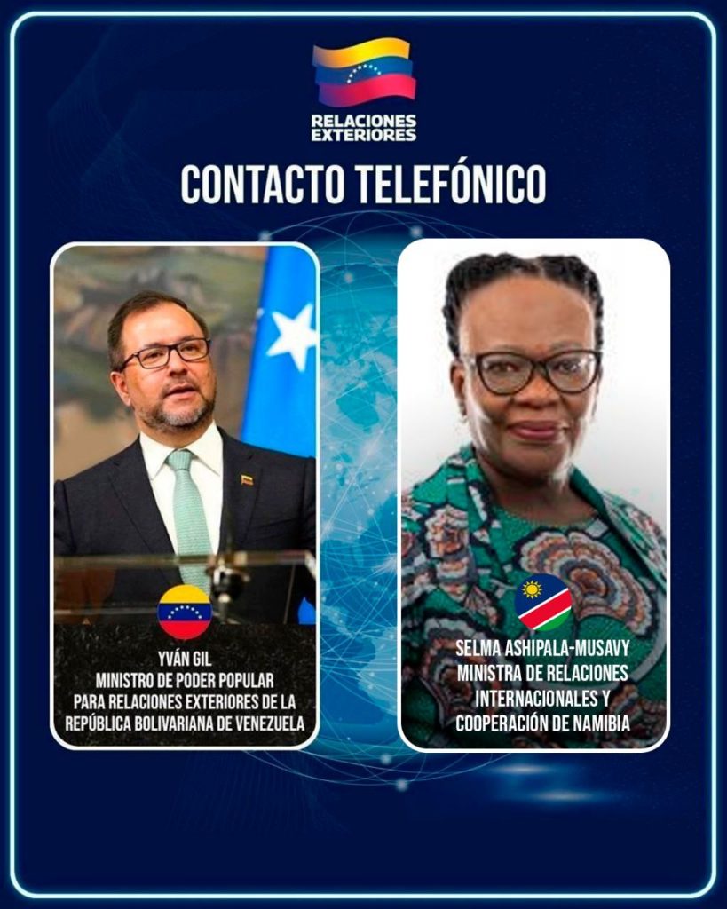 El Ministro del Poder Popular para Relaciones Exteriores de la República Bolivariana de Venezuela, Yvan Gil, informó que recibió una comunicación de solidaridad por parte de la Ministra de Relaciones Internacionales y Cooperación de Namibia, Selma Ashipala-Musavyi, en rechazo a lo que calificó como un “ataque militar criminal, vil e ilegal” contra el pueblo venezolano.