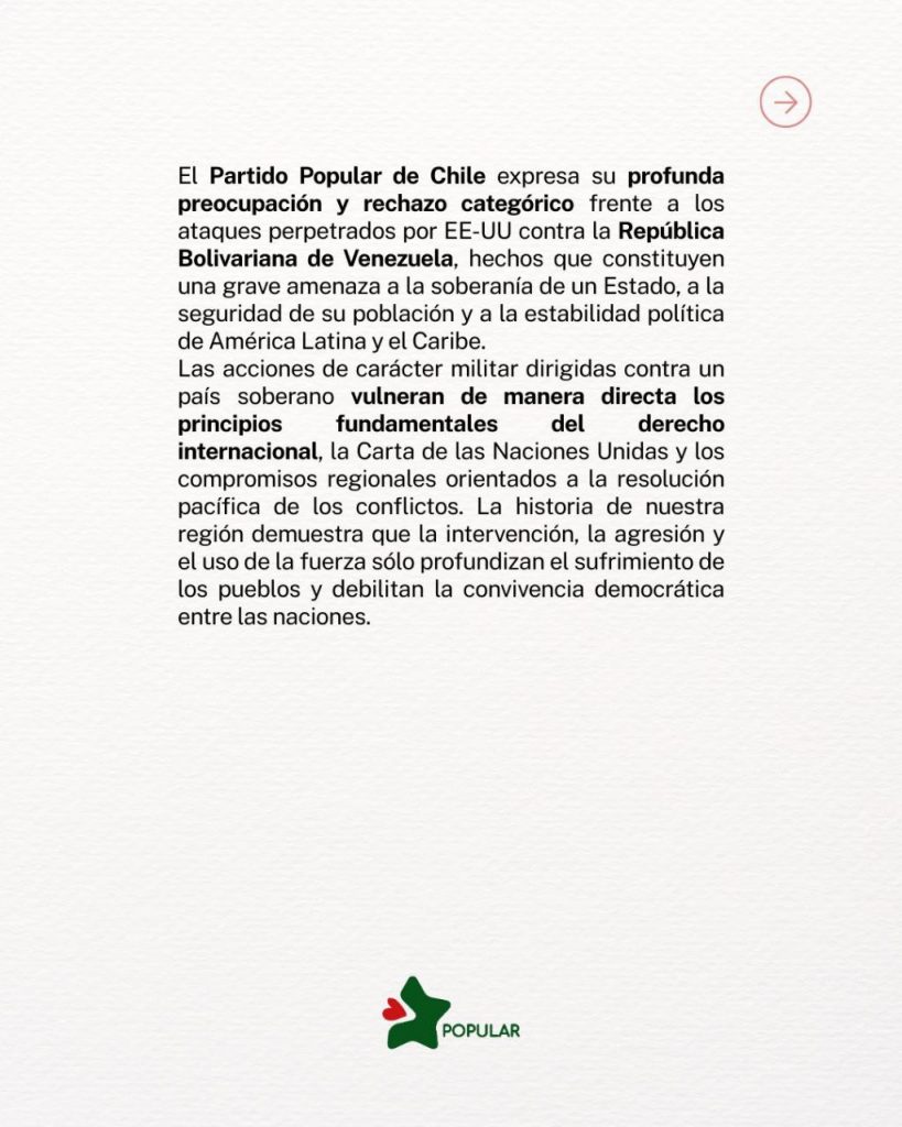 El Partido Popular de Chile manifestó hoy su profunda preocupación y rechazo frente a los recientes ataques perpetrados por Estados Unidos contra Venezuela, los cuales calificó como una amenaza grave a la soberanía, la seguridad regional y los principios del derecho internacional.