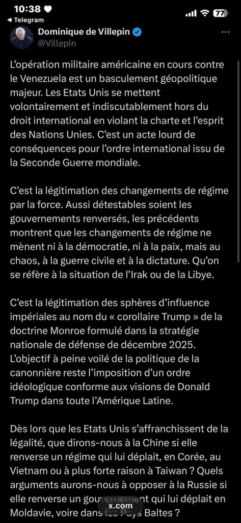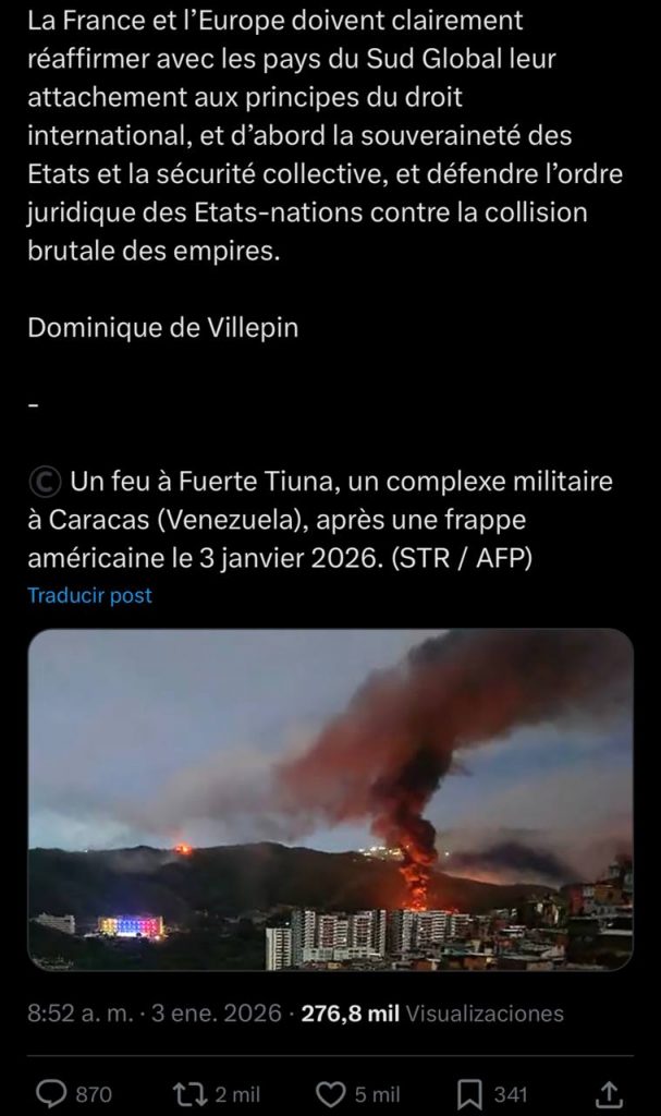 “Estados Unidos se está colocando deliberada e innegablemente al margen del derecho internacional al violar la Carta y el espíritu de las Naciones Unidas. Este acto tiene consecuencias de gran alcance para el orden internacional establecido tras la Segunda Guerra Mundial”, afirmó el exmandatario francés, conocido por su firme oposición a la invasión de Iraq en 2003.