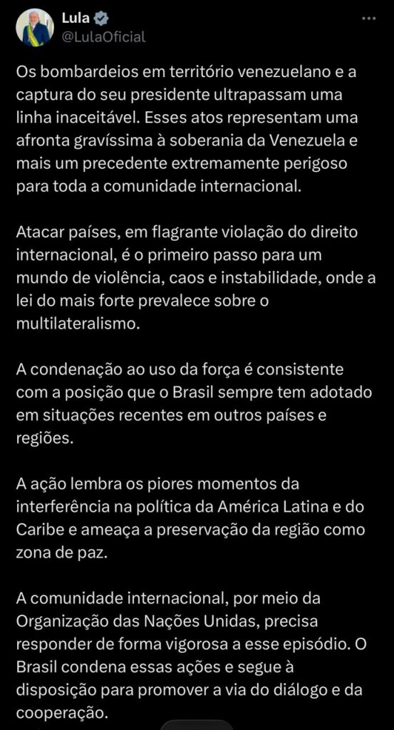 “Los bombardeos en territorio venezolano y la captura de su presidente han traspasado una línea inaceptable”, afirmó Lula. “Estos actos representan una grave afrenta a la soberanía de Venezuela y sientan un precedente extremadamente peligroso para toda la comunidad internacional”.