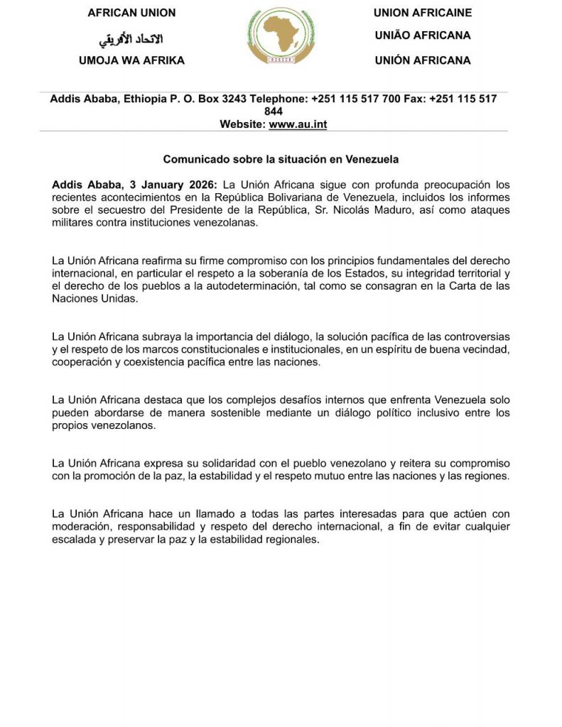 El pronunciamiento de la UA constituye un respaldo fundamental en medio de la escalada de acciones ilegales y coercitivas contra la soberanía venezolana. El pueblo y el Gobierno bolivariano confían en que la comunidad internacional continuará denunciando estas violaciones y exigiendo el cese inmediato de la agresión imperialista, así como la liberación incondicional del presidente Maduro y la primera combatiente.
