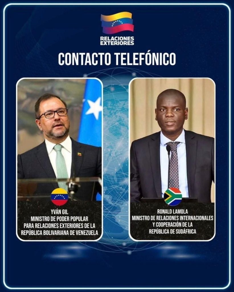 El Ministro del Poder Popular para Relaciones Exteriores de la República Bolivariana de Venezuela, Yván Gil, recibió una firme manifestación de respaldo por parte del Gobierno de Sudáfrica, en particular del Ministro de Relaciones Internacionales y Cooperación, Ronald Lamola, quien condenó enérgicamente las recientes agresiones militares unilaterales por parte de Estados Unidos contra territorio venezolano.
